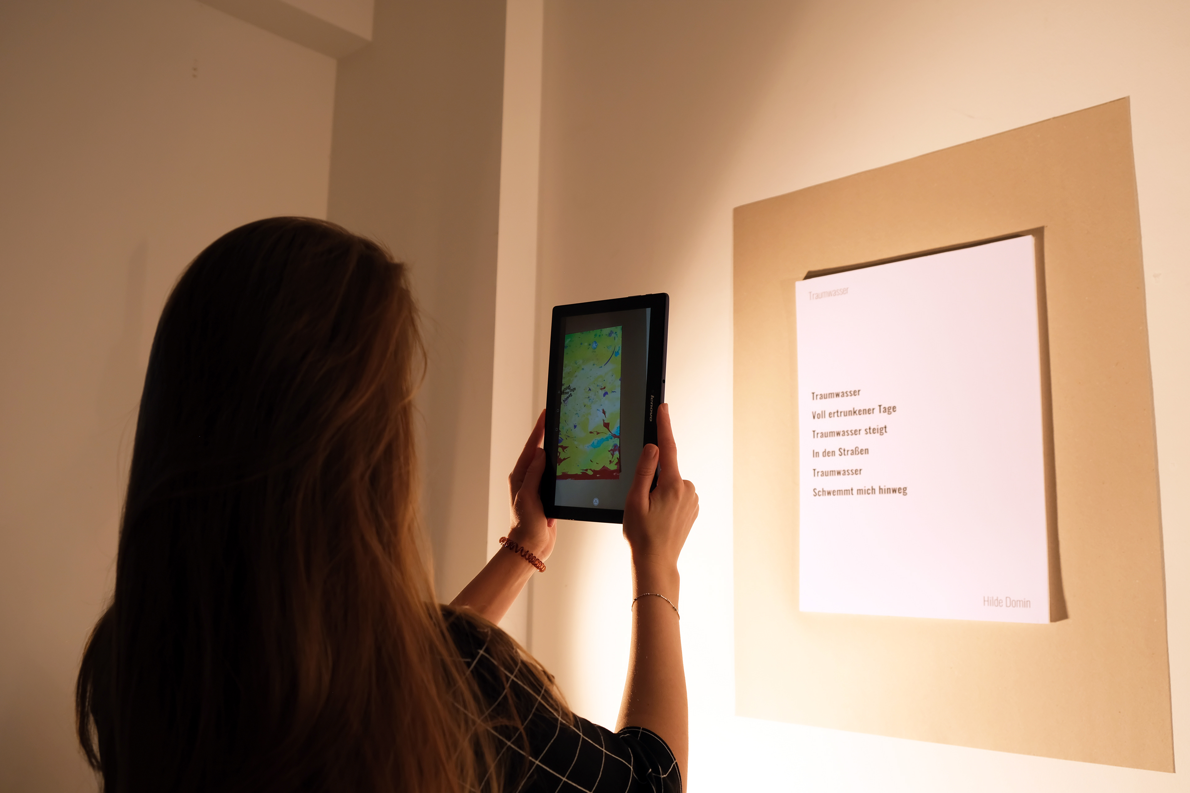 Since we also wanted to use the project to try out new techniques, we decided to use augmented reality for the exhibition. The time and intensity of viewing the by us created overlay is self-determined. The fact that the viewer interacts with the work on their own initiative also makes the experience more personal.